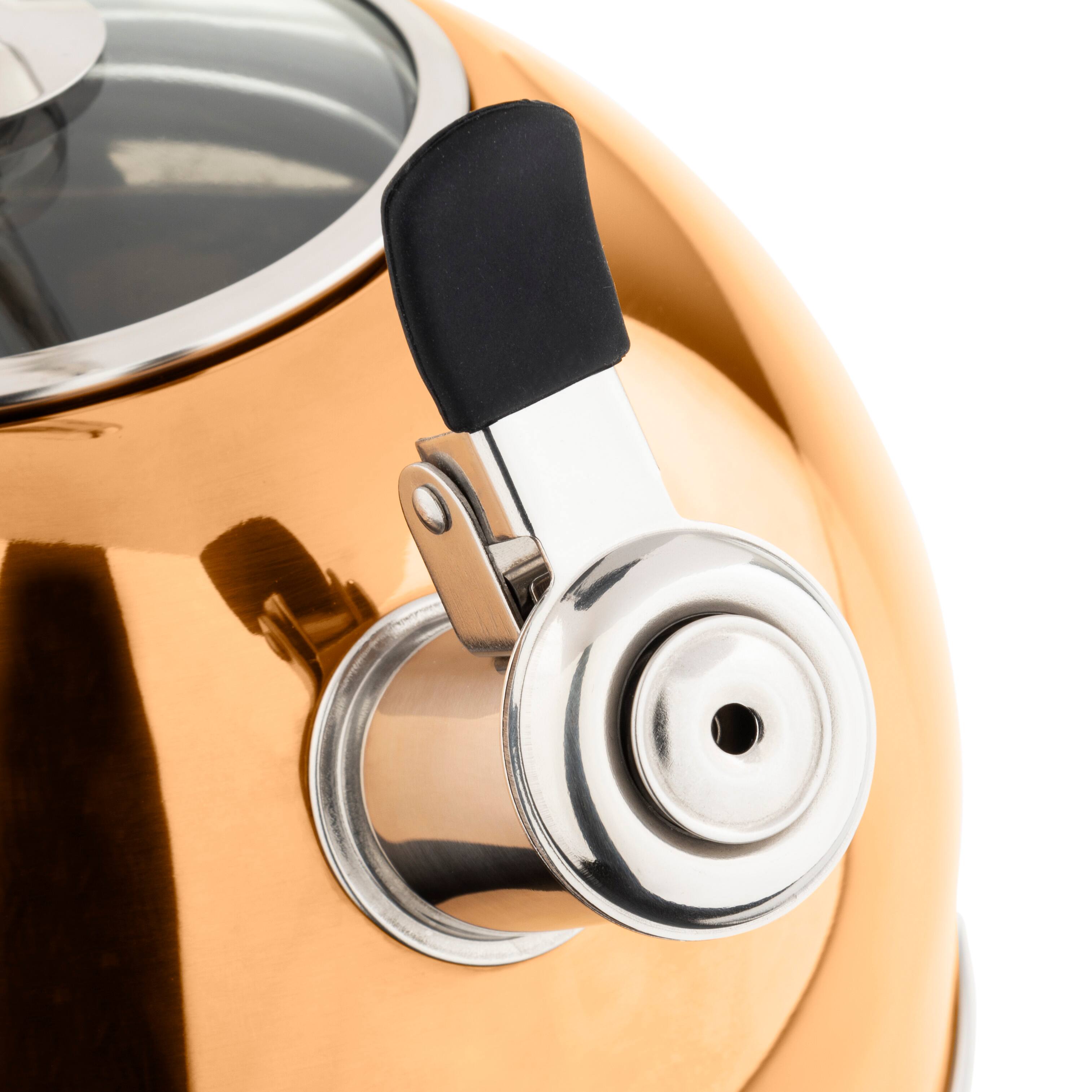 The Viking Stainless Steel 2.6 Quart Whistling Tea Kettles feature a 3-Ply base for even heat distribution that results in faster boiling.The elegant look includes a cast stainless steel handle that is riveted onto the pot for a lifetime of security and a comfortable grip while pouring and filling.The Viking Kettle is the perfect stove top accent for any kitchen and works on all stovetops, including induction. Featuring a classic design, these tea kettles bring a timeless look to any stovetop.The kettle body and spout are built with 18/8 stainless steel that is non-reactive and easy to maintain. Because the kettle is surgical grade stainless steel, it won’t impart metallic flavor into your water so you can enjoy the full-bodied flavor of your coffee, tea, instant soups and more. A thick aluminum core embedded in the stainless steel base heats evenly, allowing water to reach the boiling point more quickly than traditional kettles.The magnetic stainless steel base works on all cooktops, including induction.The Viking kettles include a glass lid that offers visibility into the heating progress for anyone that wants to debate whether or not a watched pot boils faster. Being able to see the progress of the water as it nears a boil also allows you to turn off the heat when you want to enjoy beverage that benefits from a temperature that is just off-a-boil. The levered one-touch spout includes a heat resist silicone cover and can be open and closed with a thumb or single finger.The spout’s melodic whistle alerts you to when your water is ready to serve.The stay cool handle features a heat break to reduce heat transfer to the handle and is strategically placed to keep fingers away from steam as you lift the kettle off the stove.The Viking tea kettles are available in mirror polished stainless steel and brushed stainless steel for a more traditional kitchen and in rose gold, black and copper, slate blue and Cypress Green for those who want to add a touch of color to their home.