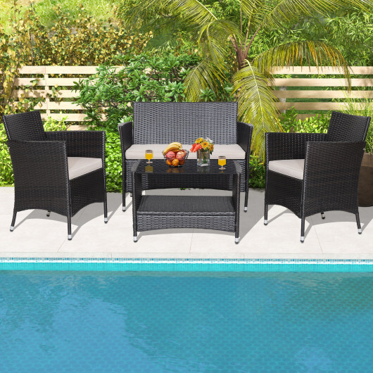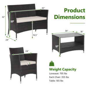 Specifications: Color of PE Rattan Mix Brown Material PE Rattan Metal Tempered Glass Polyester Foam Dimension of Table 30″ x 18″ x 19″ (L x W x H) Dimension of Each Chair 24″ x 24″ x 32″ (L x W x H) Dimension of Loveseat 43″ x 24″ x 32″ (L x W x H) Seat Height from the Ground 16.5″ Dimension of Each Small Cushion 18″ x 17″ x 3″ (L x W x Thickness) Dimension of Large Cushion 37″ x 17″ x 3″ (L x W x Thickness) Net Weight of Table 20 lbs Net Weight of Each Chair 14 lbs Net Weight of Loveseat 21 lbs Total Net Weight 69 lbs Weight Capacity of Table 165 lbs Weight Capacity of Each Chair 355 lbs Weight Capacity of Loveseat 705 lbs