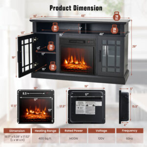 Specifications: Color: Black/Brown/Natural/White Material: engineered wood mdf steel tempered glass plastic Overall dimension of tv stand: 48″ x 16″ x 30″ (L x W x H) Dimension of electric fireplace: 19″ x 5″ x 17.5″ (L x W x H) Cord length: 6 ft Total net weight: 84 lbs Weight capacity of countertop: 70 lbs Weight capacity of each shelf: 20 lbs Rated power: 1400w Voltage: 120v Frequency: 60hz Heat output: 4777 btu Heating range: 400 sq. ft Heating sound: ≤50 db Adjustable flame brightness: 3-level Adjustable temperature: 62f-82f Effective control distance of remote control: 20 ft