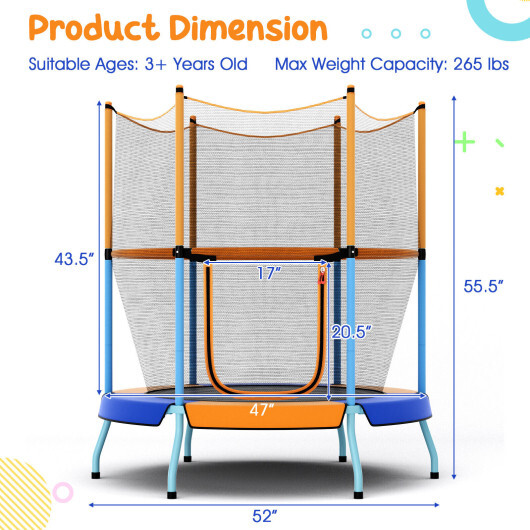 Specifications: Color Blue + Orange/Blue + Yellow Materials Metal PP EPE PE Product Dimension 52″ x 55.5″(Dia. x H) Size of Zipper Door 17″ x 20.5″(W x H) Diameter of Jumping Mat 38″ Height of Enclosure Net 43.5″ Net Weight 18.5 lbs Max Weight Capacity 265 lbs Suitable Ages 3-6 Years Old