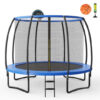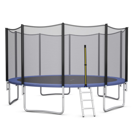 Specifications: Color: Black/Blue Material: PP PE PVC steel Overall dimensions: 8 FT x 8 FT (Dia. x H) 10 FT x 8.5 FT (Dia. x H) 12 FT x 9 FT (Dia. x H) 14 FT x 9 FT (Dia. x H) 15 FT x 9 FT (Dia. x H) 16 FT x 9 FT (Dia. x H) Diameter of the Jumping Mat: 6.5 / 8.5 / 11 / 12.5 / 13.5 / 14.5 FT Height of the closure net: 6 FT Terrain clearance: 2 FT/ 2.5 FT/ 3 FT/ 3 FT/ 3 FT/ 3 FT Number of foot tubes: 3 / 3/ 4/ 4/ 4/ 6 Suitable age: 6+ Weight capacity: 177 LBS/ 221 LBS/ 331 LBS/ 331 LBS/ 331 LBS/ 386 LBS Package included: 1 x Trampoline 1 x Accessories bag 1 x User’s manual