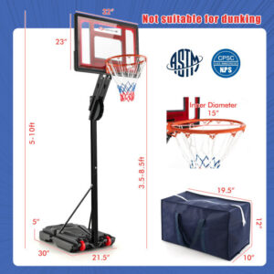 Specifications: Color: Black Material: Metal PE PET Adjustable Total Height: Remove the Middle Tube: 5-7.7 ft Install the Middle Tube: 7.5-10 ft Adjustable Rim Height: Remove the Middle Tube: 3.5-6 ft Install the Middle Tube: 5.8-8.5 ft Backboard Dimensions: 32″ x 23″ (L x W) Base Dimensions: 30″ x 21.5″ x 5″ (L x W x H) Weight Bag Dimensions: 19.5″ x 10″ x 12″ (L x W x H) Inner Diameter of Basketball Rim: 15″ Diameter of Transport Wheel: 3.5″ Added Weight: 9.2 gallon Water or 86 lbs Sand Added Weight of Weight Bag: 77 lbs Sand Net Weight: 35 lbs