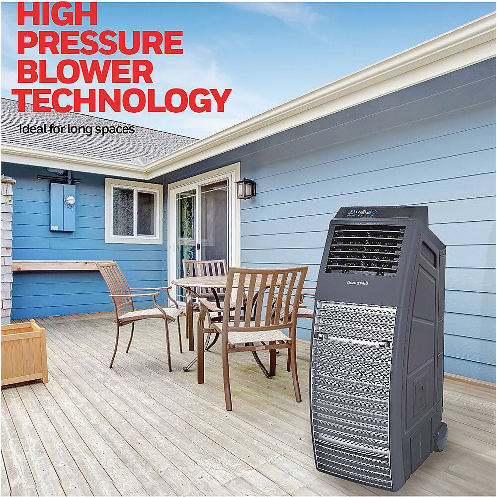 Cool down outdoor events with this Honeywell portable evaporative cooler. The outdoor design resists shifting weather conditions, while the three-in-one cooling functionality improves effectiveness by combining humidification and a fan to help combat dry heat. This Honeywell portable evaporative cooler includes a storage compartment to keep the remote safe and a drink holder for colder beverages.