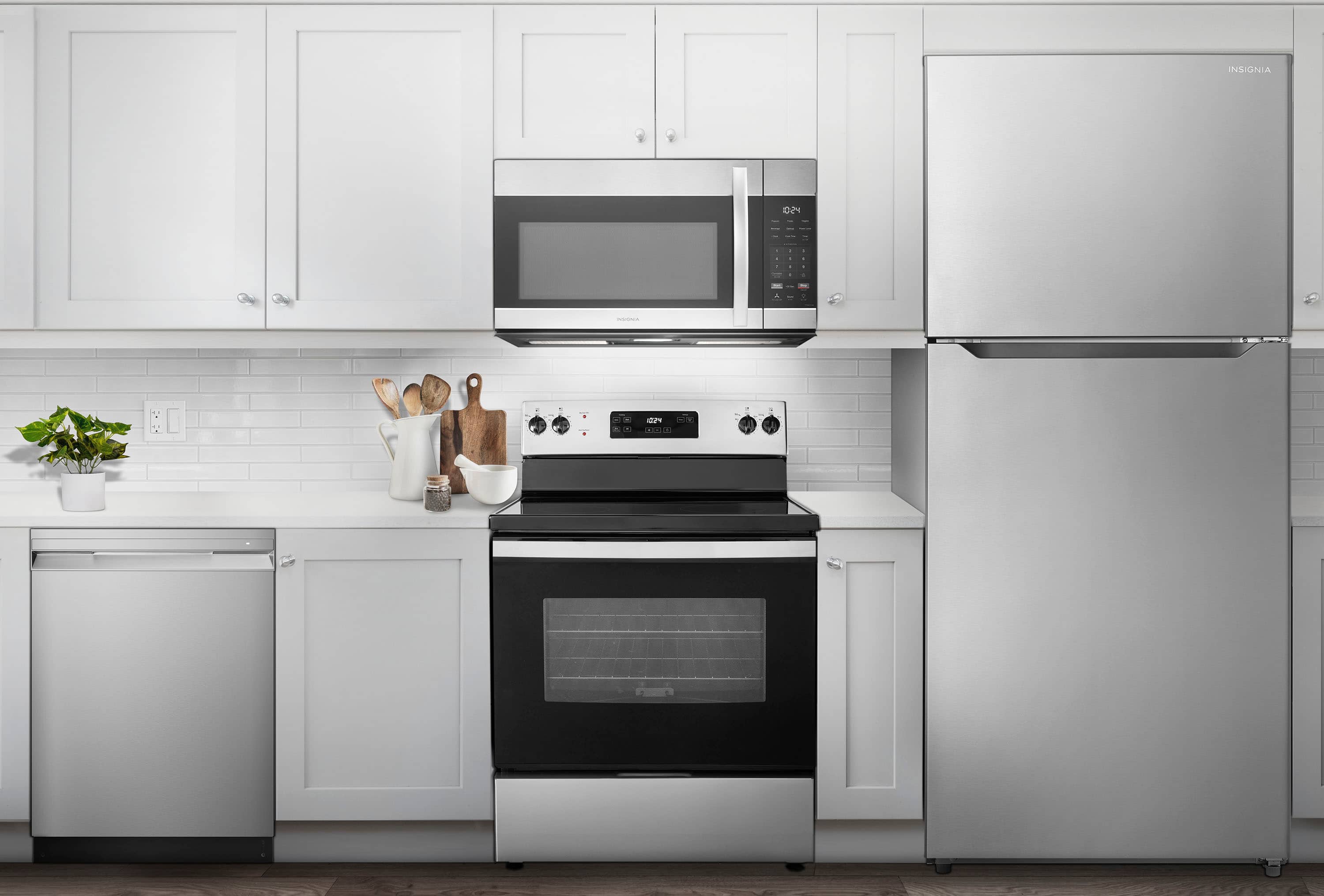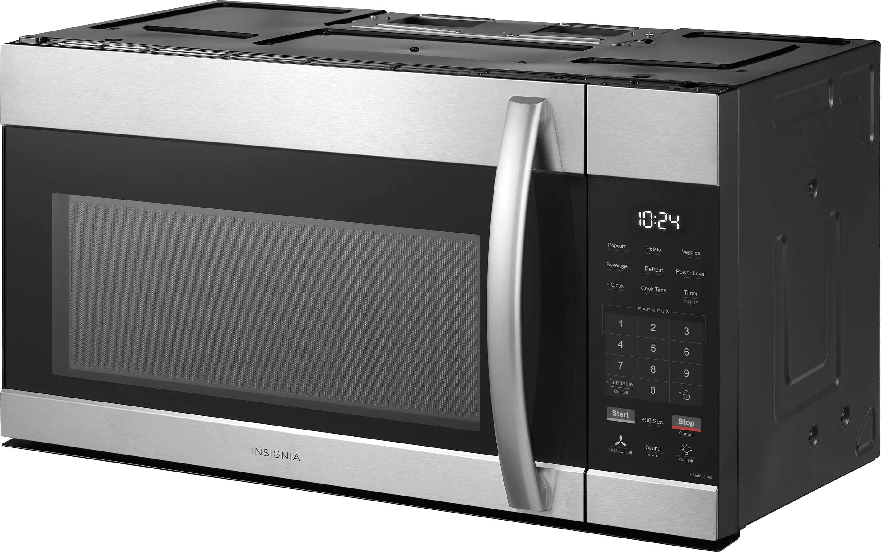 The Insignia Over-the-Range Microwave has 1000W of power and a 1.7 cu. ft. interior that makes it perfect to cook or reheat meals. Nine auto-cook settings, ten power levels, a defrost setting and a two-speed exhaust fan grant ideal heating for any type of dish. Control it all with a simple and straight-forward digital LED display and pre-labeled buttons. A removable 13.6 in. glass turntable ensures that your food is evenly heated and makes cleaning the inside of the microwave easy to do. Offering a modern design, this over-the-range microwave saves you counter space and illuminates the work surface below.