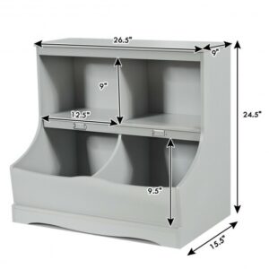 Specifications: Color: White/Grey Material: MDF board Overall dimension: 26.5″ x 15.5″ x 24.5″ (L x W x H) Net weight: 25 lbs Bearing capacity of shelf top: 66 lbs Bearing capacity of each bin: 33 lbs Bearing capacity of each cubby: 22 lbs Package includes: 1 x Multi-bin storage organizer