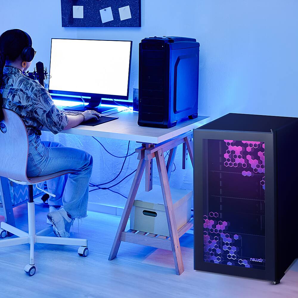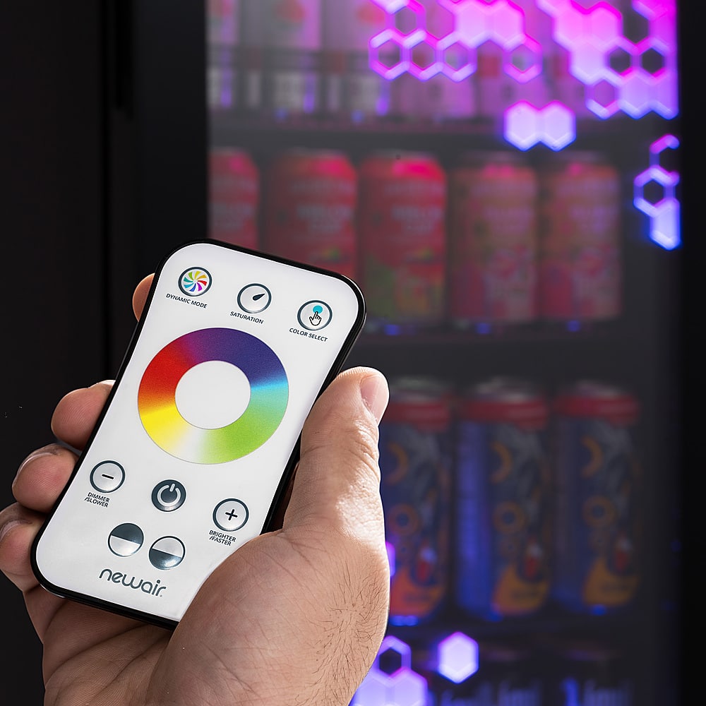 Colors come alive with the Newair Prismatic Series Beverage Fridge with RGB HexaColor LED Lighting. This fridge features a Newair original hexagon-inspired design with two zones of vibrant RGB lighting that seamlessly blend with your style. With over 50+ different color combinations and 10 preset Dynamic mode effects on two independent color zones, you can easily create a mesmerizing visual display that matches your unique style. The intuitive Color Wheel remote control allows for effortless customization, while the set-and-forget thermostat ensures quiet and efficient operation. Keep your favorite beverages, snacks, and essentials within arm’s reach and transform your beverage fridge into a statement piece. Whether you’re gearing up for a gaming session or entertaining guests, the Newair Prismatic Series Fridge won’t just elevate your space. It will elevate your experience.