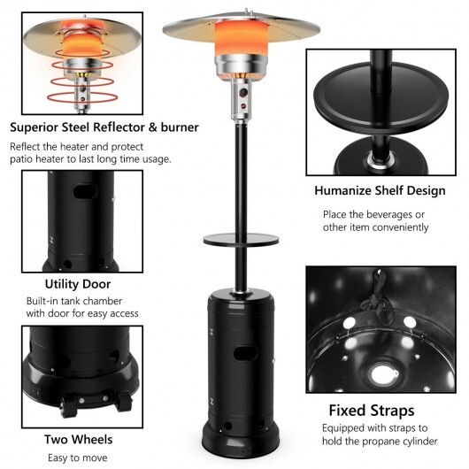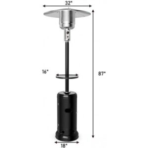 Specifications: Color: Black/Brown/Gray/Silver Product size: 32″ x 32″ x 87″(L x W x H) Base size: Dia.18 x 3.5 inch Cylinder housing size: 15 x 30 inch Combustion screen size: Dia.11 x 8.5 inch Reflector cover size: Dia.32 inch Desktop diameter 16 inch Main strut size: 2.5 x 33.5 inch Power: 48000 BTU Combustion capacity: 1~2 lbs/h Fuel: 20 lbs Propane cylinder Net Weight: 35 lbs Package includes: 1 x Heater 1 x Shelf 1 x Instruction