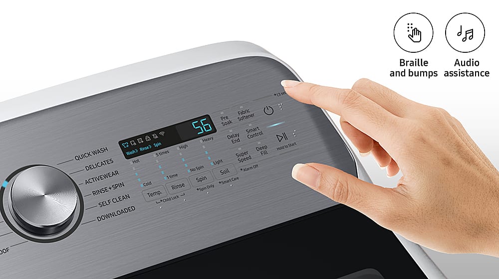 Samsung’s 5.1 cu. ft. Large Capacity Top Load Washing Machine features our ActiveWave Agitator that is designed to reduce noise, vibration and tangling, while delivering powerful cleaning. Super Speed Wash powerfully cleans a full load of laundry in just 28 minutes without sacrificing cleaning performance. With Wi-Fi connectivity, you can remotely start, stop, or delay your smart washer from our simple-to-use SmartThings App. Purchase with confidence with a 20-year warranty on the Digital Inverter Motor.