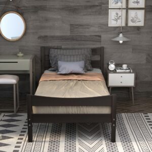 Twin Size Rustic Style Platform Bed Frame with Headboard and Footboard-Dark Brown – Color: Dark Brown