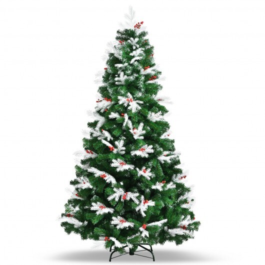 Unlit Snowy Hinged Christmas Tree with Mixed Tips and Red Berries-7′ – Color: Green – Size: 7 ft